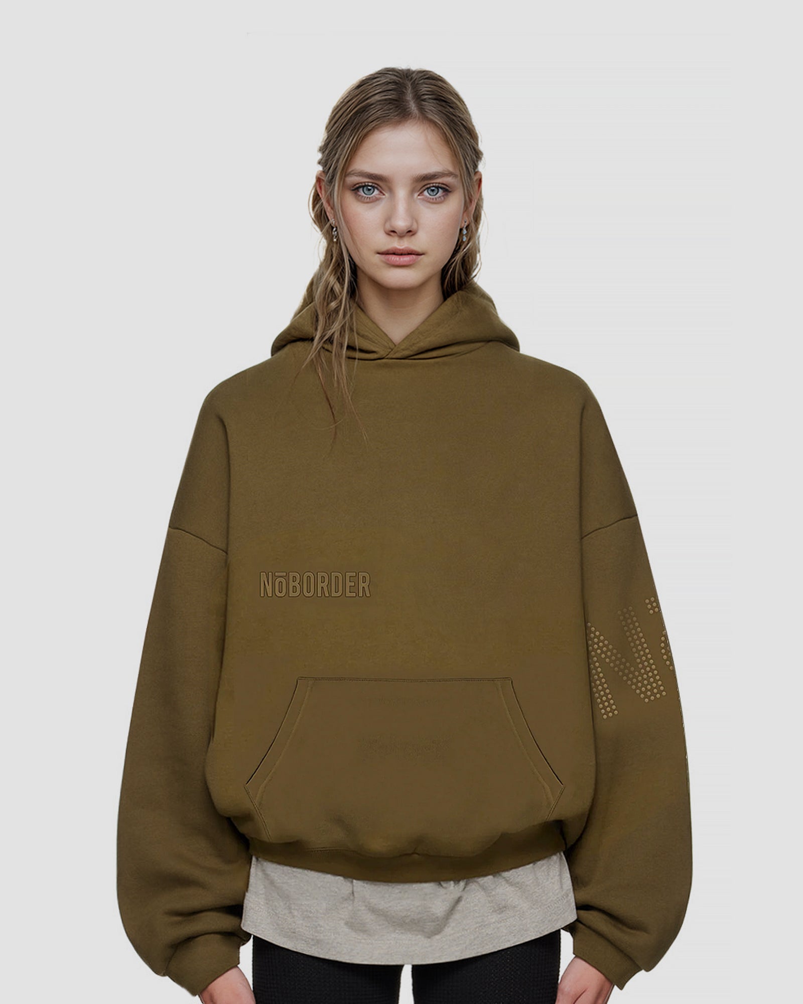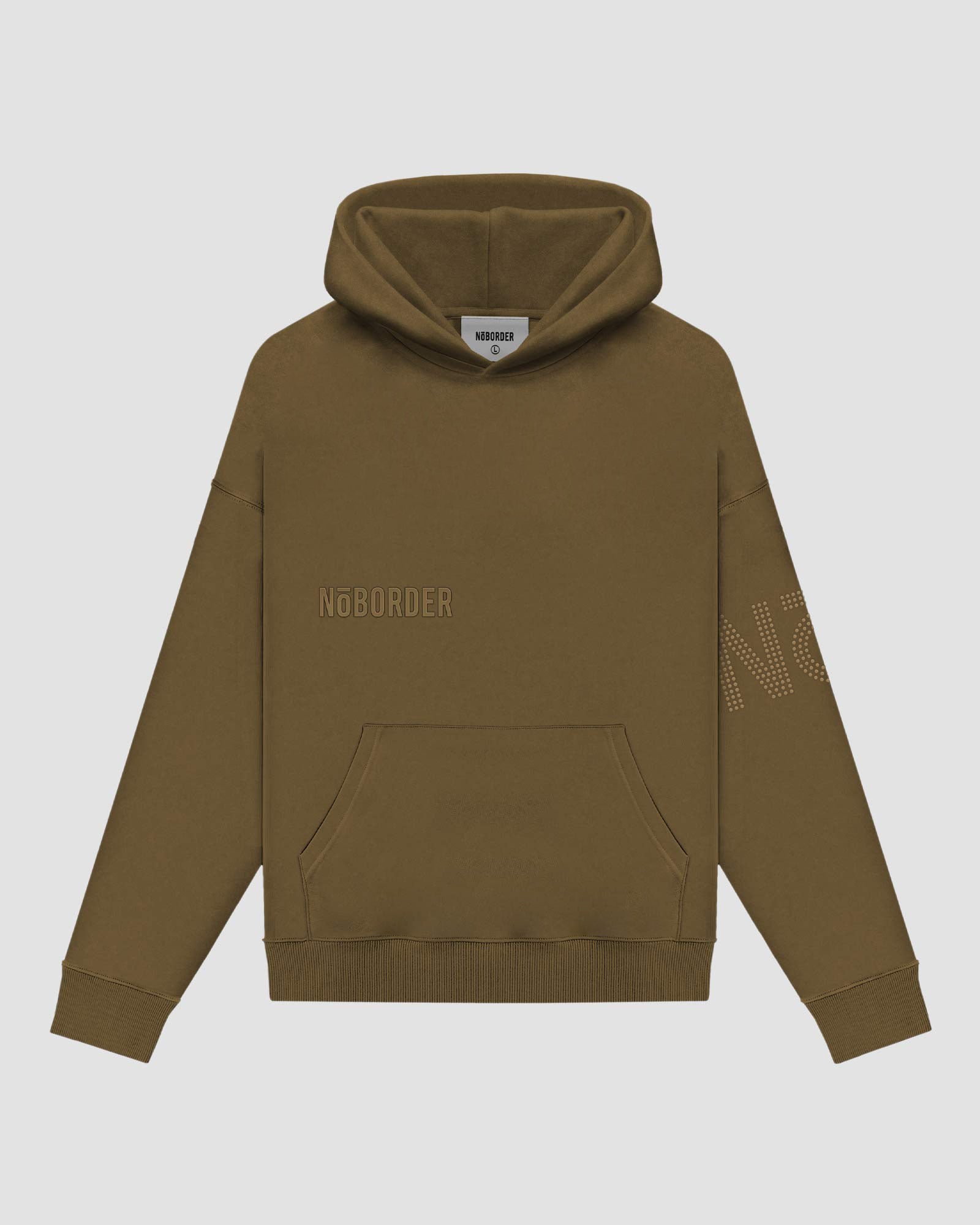 The "NOBORDER" hoodie is crafted from a thick, comfortable 100% cotton fleece, perfect for the A/W season. Key details include an overlapping neckline, a relaxed-fit body, and a front pocket. The NOBORDER label and print are tastefully placed for added style.