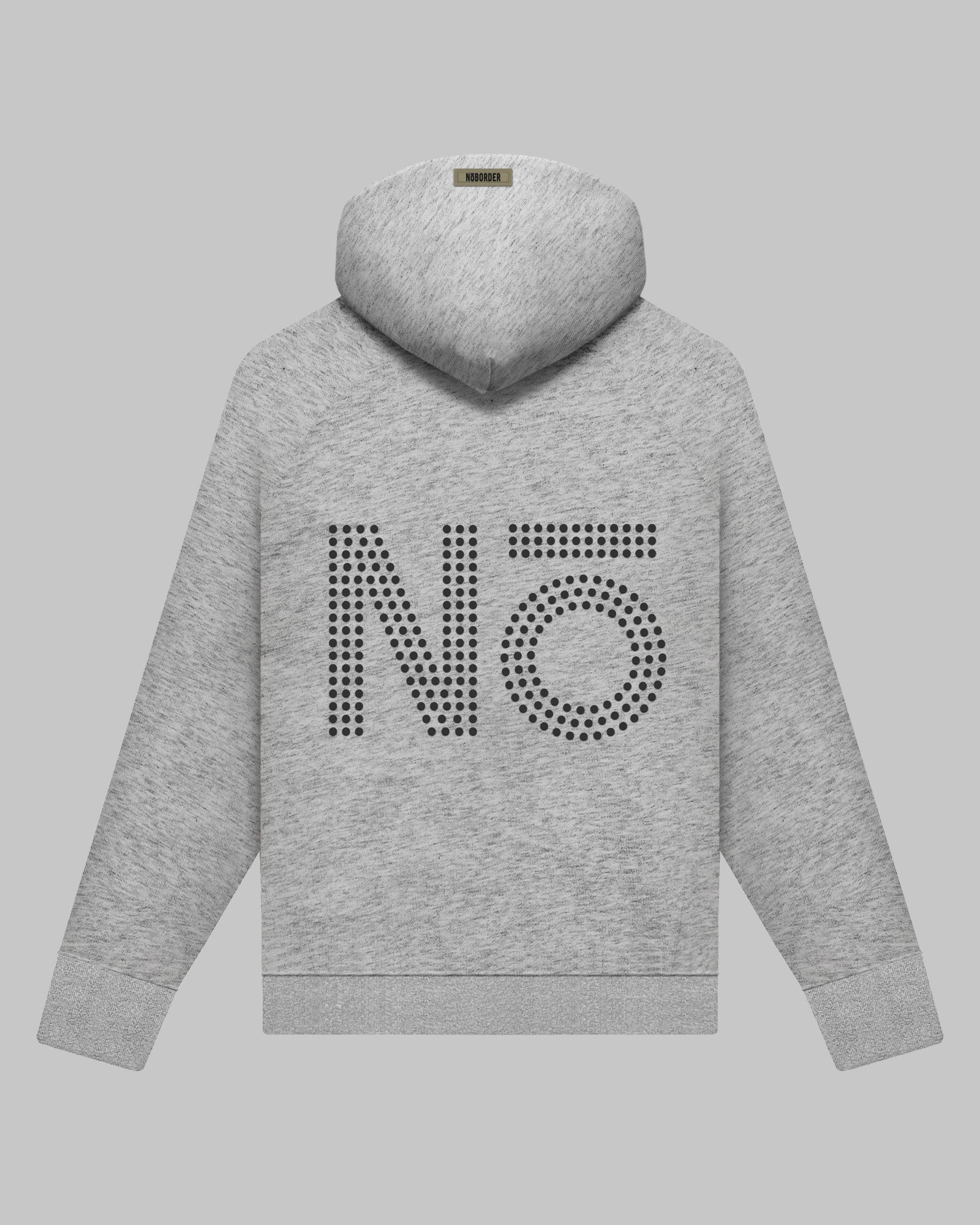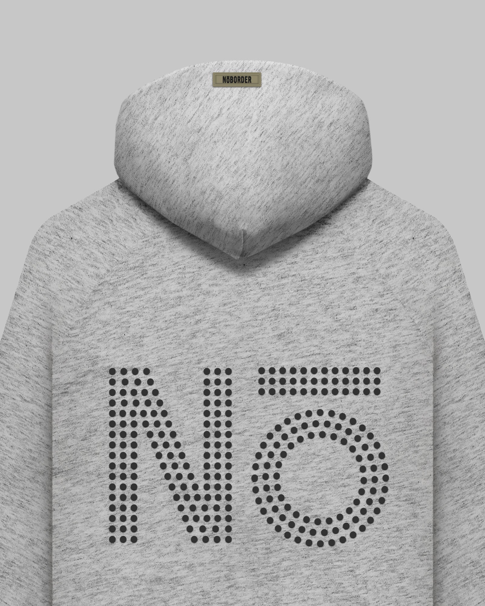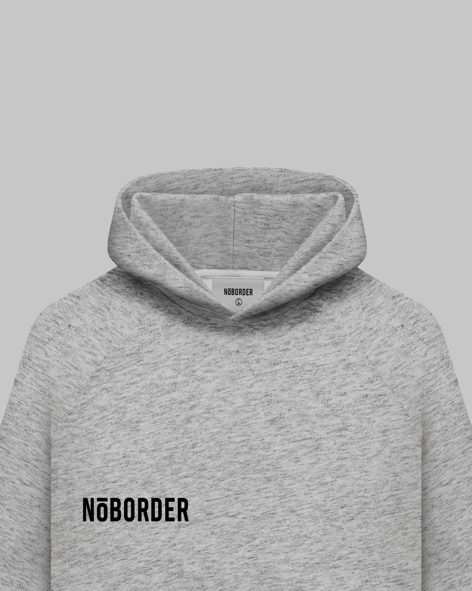 The "NOBORDER" hoodie is crafted from a thick, comfortable 100% cotton fleece, perfect for the A/W season. Key details include an overlapping neckline, a relaxed-fit body, and a front pocket. The NOBORDER label and print are tastefully placed for added style.